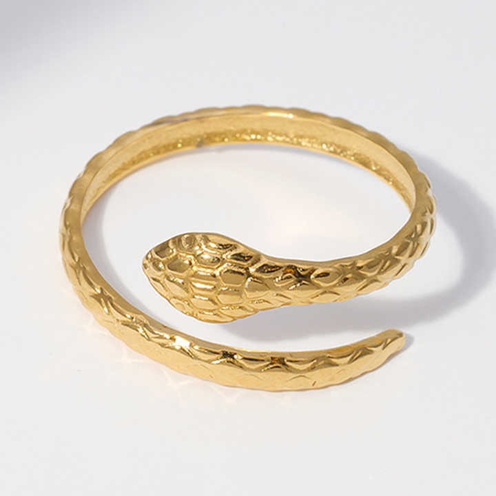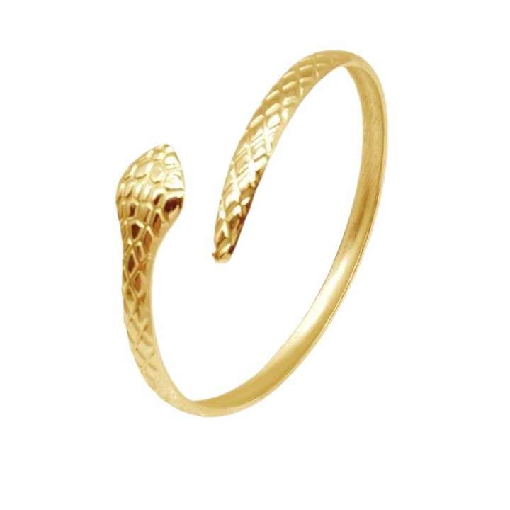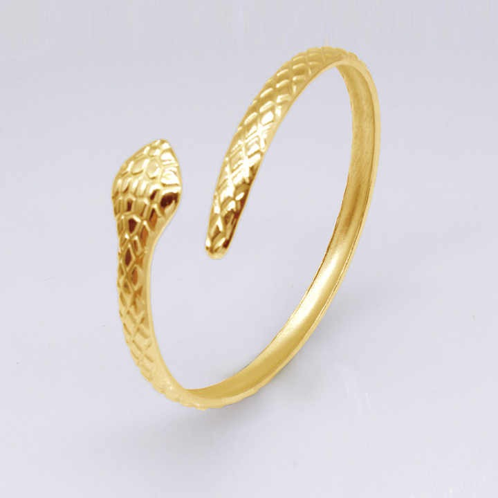 تتميز هذه الاسوارة الذهبية بتصميمها الفريد والجريء المستوحى من شكل الأفعى، حيث تلتف بشكل أنيق حول المعصم دون الحاجة لقفل. أحد طرفي الاسوارة مصمم على شكل رأس الأفعى، والطرف الآخر يمثل ذيلها، وكلاهما مزين بنقوش دقيقة تحاكي حراشف الثعبان، مما يضفي عليها لمسة فخامة وغرابة. هذه الاسوارة هي قطعة مميزة للنساء اللواتي يفضلن الإكسسوارات العصرية ذات التصميم غير التقليدي، وتعتبر إضافة جريئة وأنيقة لأي إطلالة.