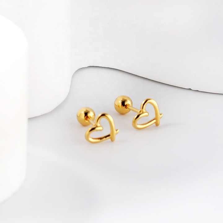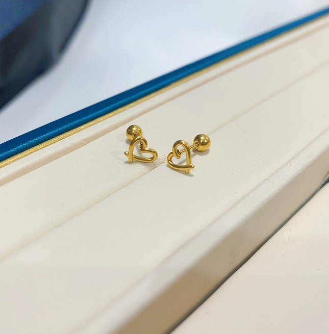 يتميز هذا الزوج من الأقراط الذهبية بتصميم فريد ومبتكر على شكل قلب عقدة ملتفة، مما يضفي لمسة فنية وعصرية. كل قرط مصقول بعناية ليعكس بريق الذهب الجذاب، ومثبت بمسمار خلفي ينتهي بكرة ذهبية، مما يوفر تثبيتاً آمناً ومريحاً للأذن. هذه الأقراط مثالية للارتداء اليومي أو لإضافة لمسة مميزة وغير تقليدية إلى الإطلالات، وهي تعبر عن الأناقة العصرية مع لمسة من المرح.
