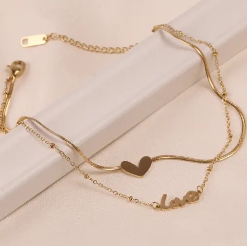 عبري عن مشاعركِ بأناقة ورقة مع هذا الخلخال الجذاب ذو الطبقتين، المصنوع من الفولاذ المقاوم للصدأ عالي الجودة والمطلي بلمسة ذهبية ساحرة. يتميز الخلخال بتصميم فريد يجمع بين سلسلة ثعبانية ناعمة تزينها حلية على شكل قلب، وسلسلة أخرى رفيعة مزينة بخرزات صغيرة وحلية كلمة “Love” بخط أنيق. هذا التناغم بين الرموز الجميلة والتصميم العصري يجعله قطعة مثالية لتعزيز أناقتك اليومية أو كهدية معبرة لمن تحبين. مزود بقفل سرطان البحر وسلسلة تمديد لضمان ملاءمة مثالية.