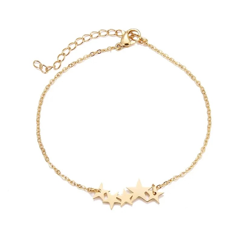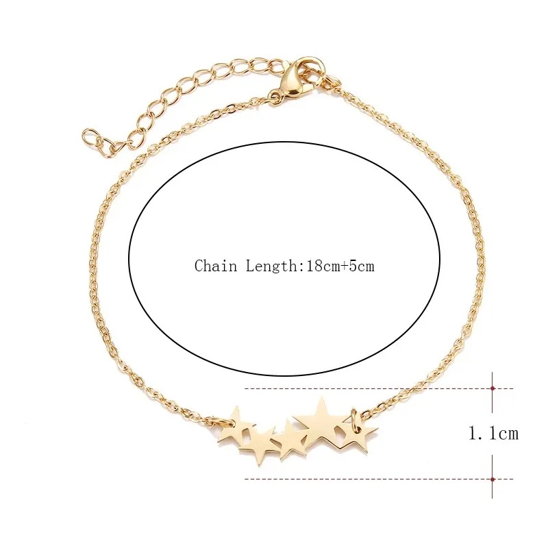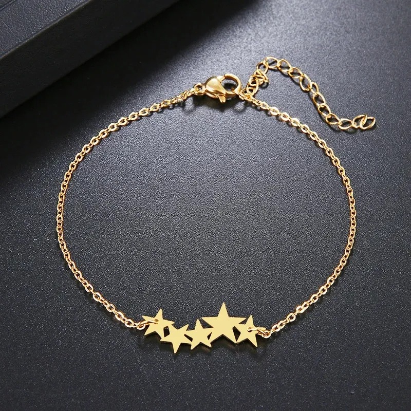 تتميز هذه الاسوارة الذهبية الرقيقة بتصميم أنيق وبسيط، حيث تتكون من سلسلة رفيعة مزينة بخمسة نجوم ذهبية متراصة بأحجام متفاوتة، مما يخلق مظهراً جذاباً ولافتاً. النجوم مصقولة لتعكس بريقاً ناعماً، وتتصل الاسوارة بقفل محكم مع سلسلة تمديد لضمان مقاس مناسب ومريح. هذه الاسوارة هي إضافة مثالية للإطلالات اليومية، وتضفي لمسة من الأناقة العصرية والسماء المرصعة بالنجوم على معصم المرأة. كما تعتبر هدية لطيفة ومميزة تعبر عن التقدير والتألق.