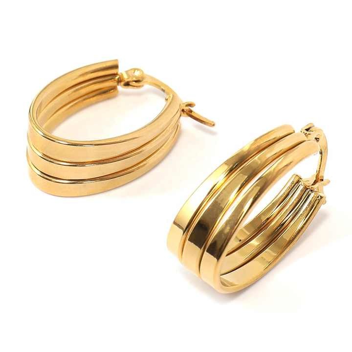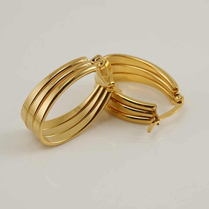 يتميز هذا الزوج من الأقراط الذهبية بتصميم عصري وأنيق على شكل كفة سميكة تتكون من ثلاث حلقات ذهبية متراصة ومتصلة بإحكام، مما يعطيها مظهراً ثلاثي الأبعاد وكبيراً. السطح المصقول واللامع للذهب يضفي عليها بريقاً جذاباً وفخامة. هذه الأقراط مثالية لإضافة لمسة من الجرأة والأناقة العصرية إلى أي إطلالة، وهي سهلة الارتداء بفضل قفلها المفصلي الذي يضمن تثبيتاً آمناً ومريحاً. إنها خيار رائع للنساء اللواتي يفضلن الإكسسوارات المميزة والملفتة للنظر.