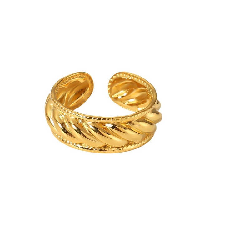يتميز هذا الخاتم الذهبي بتصميم جريء وعصري على شكل كفة عريضة، مزينة بنقوش بارزة وملتوية تحاكي شكل الضفائر أو الحبال الملتفة. يضفي هذا التصميم الفريد مظهراً ثلاثي الأبعاد وعمقاً بصرياً، بينما يعكس السطح المصقول للذهب بريقاً جذاباً. الخاتم مصمم بشكل مفتوح وقابل للتعديل ليناسب مقاسات مختلفة، مما يجعله مريحاً وعملياً للارتداء اليومي. إنه قطعة إكسسوار أنيقة ومميزة تضفي لمسة من الأناقة العصرية والتميز على يديك.
