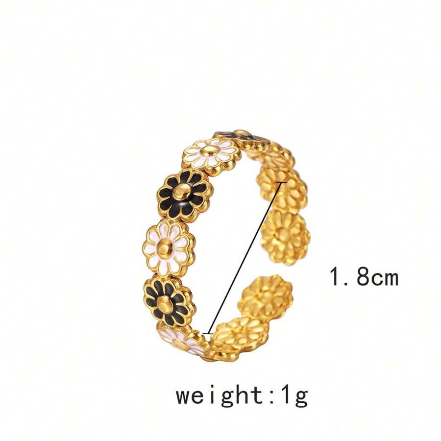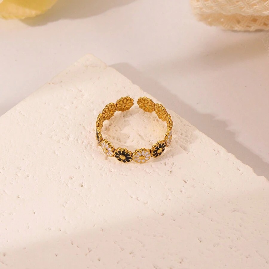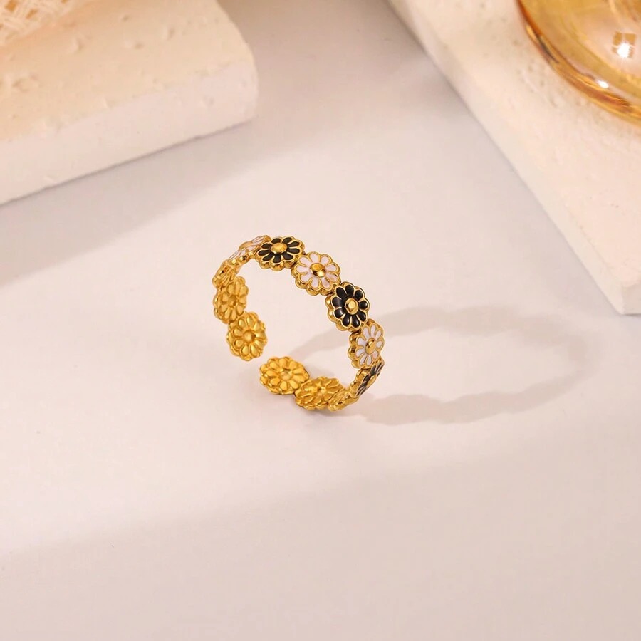 يتميز هذا الخاتم الذهبي بتصميم ساحر ومبهج على شكل صف من زهور الأقحوان المتصلة، تتناوب فيها الألوان ما بين الأبيض الناصع والأسود الأنيق، مع مركز ذهبي لامع لكل زهرة. يضفي هذا التناوب اللوني مظهراً حيوياً وعصرياً، بينما يمنح التصميم الزهري لمسة من الأنوثة والرقة. الخاتم مصمم بشكل مفتوح وقابل للتعديل ليناسب مقاسات مختلفة، مما يجعله مريحاً وسهل الارتداء. إنه قطعة مثالية لإضافة لمسة مرحة وملفتة للنظر إلى إطلالتك اليومية أو كهدية فريدة تعبر عن البهجة.