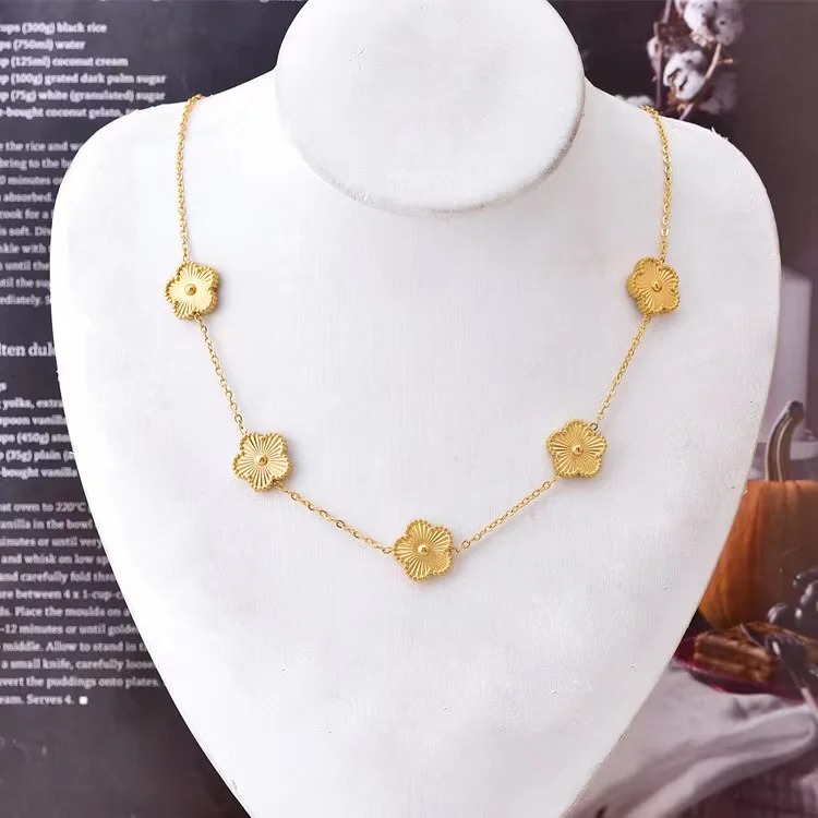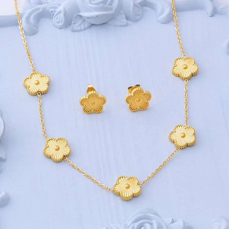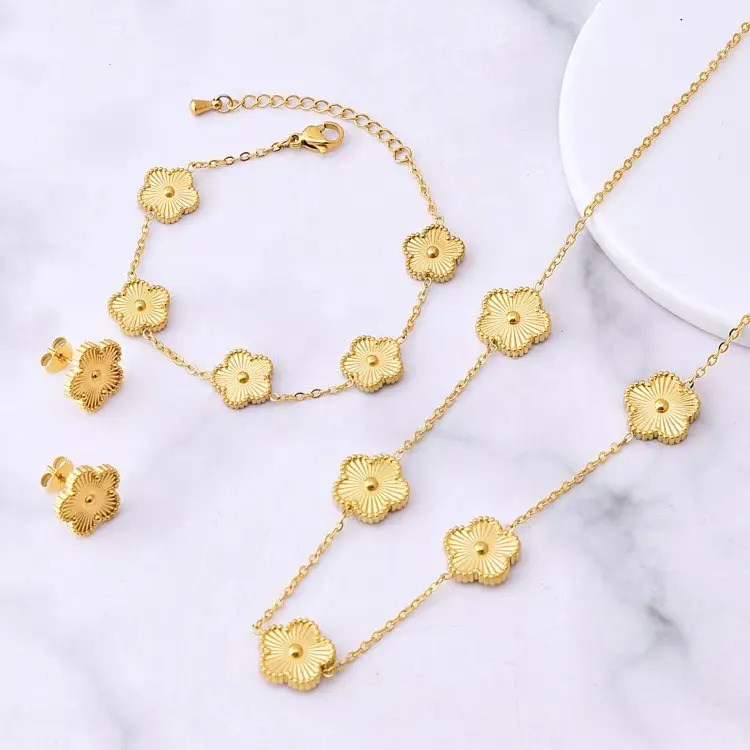هذا الطقم الذهبي الأنيق يتكون من ثلاث قطع متناسقة: أقراط، قلادة، واسوارة، جميعها مزينة بتصميم زهور البرسيم الأنيقة ذات اللون الذهبي المصقول. تتميز كل زهرة بتفاصيل دقيقة وحواف مزخرفة تضفي عليها مظهراً فاخراً. القلادة والاسوارة تتميزان بسلسلة رقيقة متصلة بعدة زهور متماثلة، بينما الأقراط تأتي بتصميم زهرة واحدة لكل أذن. هذا الطقم مثالي لإضافة لمسة من الرقي والأنوثة إلى أي إطلالة، ومناسب جداً للمناسبات الخاصة أو كهدية قيمة.