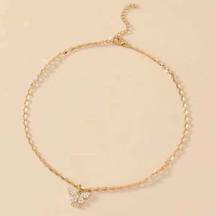 تتميز هذه القلادة الذهبية الفاخرة بتصميمها الأنثوي الساحر، حيث تتألف من سلسلة رفيعة ذات حلقات بيضاوية دقيقة، يتدلى منها تعليقة على شكل فراشة أنيقة. أجنحة الفراشة مرصعة بالكامل بفصوص لامعة، تضفي عليها بريقاً مبهراً وتجعلها تلتقط الضوء بجمال. هذه القلادة هي قطعة مثالية للمناسبات الخاصة أو لإضافة لمسة من الرقي والفخامة للإطلالات اليومية، وتعد هدية رائعة تعبر عن الجمال والرقة للنساء.