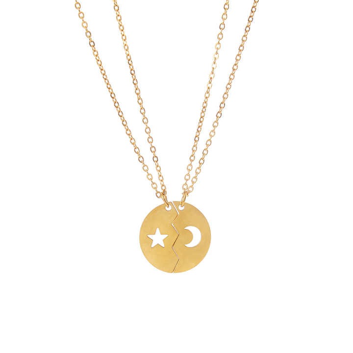 تتميز هذه القلادة الذهبية الأنيقة بتصميم فريد من قطعتين متطابقتين، يمثل كل منهما نصف دائرة. إحدى القطعتين مزينة بشكل نجمة، والأخرى بشكل هلال، لتشكلا معًا دائرة كاملة عند اجتماعهما. القلادتان متصلتان بسلسلتين رفيعتين، مما يجعلها مثالية للنساء كهدية مميزة لصديقة مقربة، أخت، أو للتعبير عن رابط خاص، لترمز إلى التكامل والترابط. تصميمها البسيط والعصري يجعلها مناسبة للارتداء اليومي أو للمناسبات الخاصة.